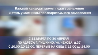 В округе Пушкинский стартовало предварительное голосование по кандидатурам для последующего выдвижения от партии «Единая Россия». С 11 марта по 30 апреля кандидаты могут подать заявки на участие в предварительном отборе. Приём документов пройдёт по адресу: г. Пушкино, улица Чехова, 37.